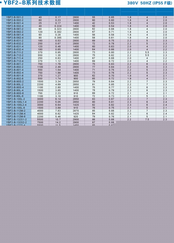 YBF2-B系列电机制成隔爆型、防爆标志为dⅠ、dⅡAT4、dⅡBT4,分别适用于煤矿井下及工厂、ⅡA级、ⅡB级,温升组别