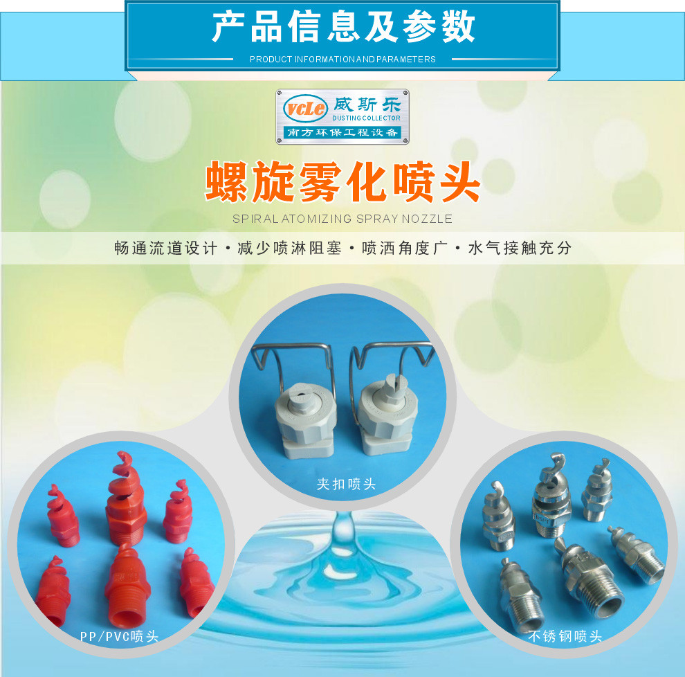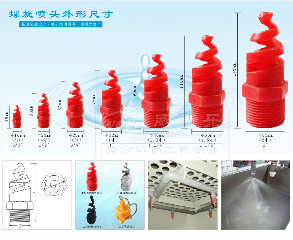 “螺旋喷头”是一种结构紧凑,防堵塞,使用范围广的高效雾化喷嘴,液体通过连续变小的螺旋线体相切和碰撞后,变成微小的液珠喷出而产生锥形喷雾形状,在2~3巴压强下,液体流率范围为50~500l/min,喷洒角度一般在60°-160°范围;该喷头的紧凑独特结构有着畅通的流道设计,可减少液体阻塞,使液体喷淋设备上得到较大流量及喷洒角度。通常材质有塑胶PP/PVC(聚丙烯或聚氯乙烯),不锈钢304、316L及陶瓷等;连接方式有外螺纹及法兰连接,规格:3/8,1/2,3/4,1,1-1/2等。广泛用于:工业除尘,废气洗涤,烟气脱硫,降温冷却,防火灭火以及各种喷淋塔,洗涤塔等装置。