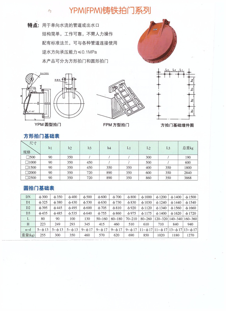 hdpe聚乙烯塑料拍门——主要安装在排水管道的尾端,用于防止外水倒灌。材质分为不锈钢、铸铁、型钢、等多种材料。是安装在江河边排水管出口的一种单向阀,当江河潮位高于出水管口,且压力大于管内压力时,拍门面板自动关闭,以防江河潮水倒灌进排水管道内。目前拍门分为悬挂式,单开门/双开门等型号。