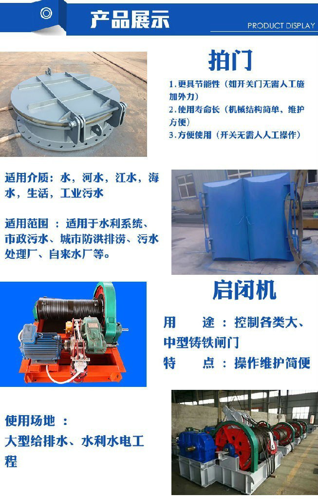 ② 浮箱拍门在应用的时候,能够经过向门页密封腔体内注水或者是放水的方法改变门页的比重,能够达到*的开启的作用。