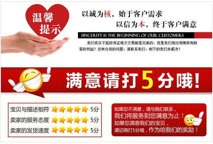 6、本店致力于运输零破损,并始终以顾客权益为服务的**高考量。物流不是卖家能控制,若出现问题愿意积极帮助买家从中协商,但是不能对产生的问题负责。拒绝因物流中差评客人,**主义者请绕道! 一旦出现运输意外损坏或者您对商品有任何不满与疑问,请毫不犹豫的**时间联系本店,我们将尽力确保您的利益并真诚为你解决问题。