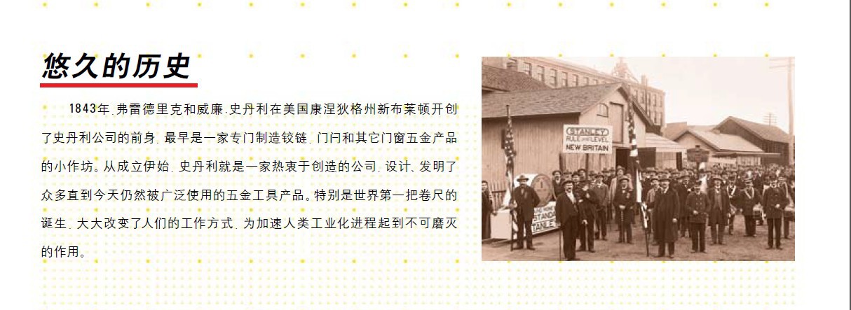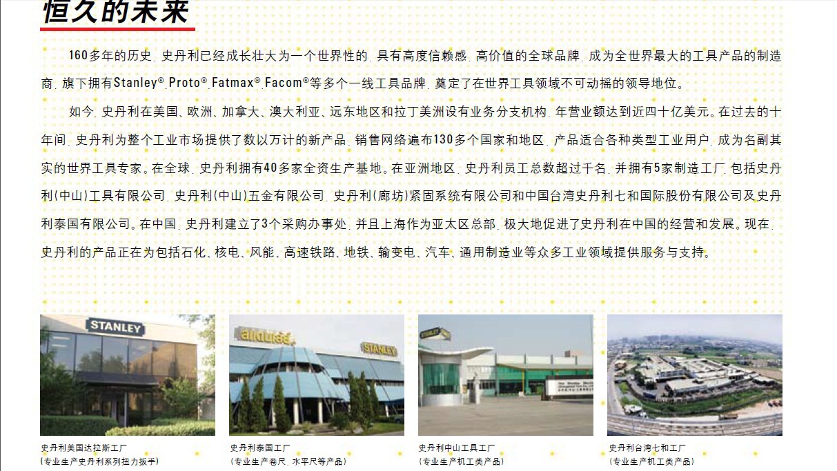 美国史丹利(STANLEY)是**一个享誉全球的五金工具品牌,并以其卓越的品质和创新精神著称于世。史丹利公司成立于1843年,如今已发展成为全**大的工具、五金和各类门产品的制造商,在全球各个**设有办事机构,营销网络遍布全球,产品销往世界各地,是美国《财富**选出的全美五百家大公司之一。公司是纽约证券交易所的上市公司,股票分红稳步增长,在11家同行业公司中位居******,史丹利已被世人公认为是**品质和卓越价值的代名词。