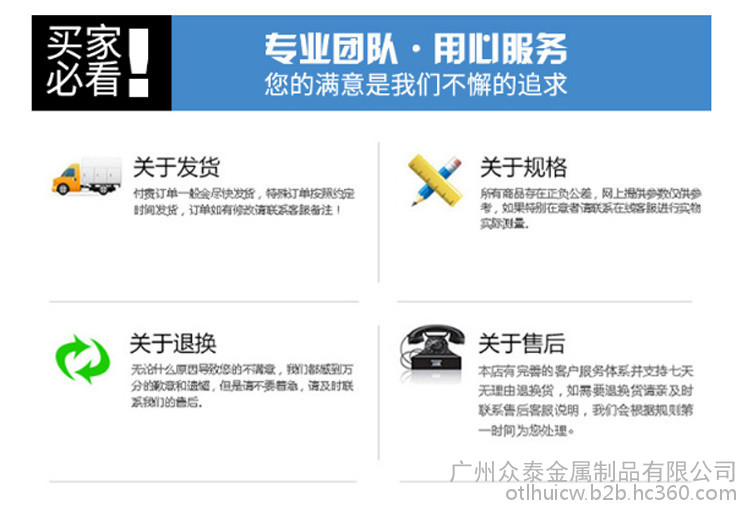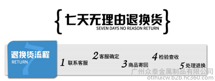 3.若退换货:任何本公司原因,如发错货、货有质量问题等,本公司承担来回运费,并无理由退款!如客户自己选错规格或材质等原因,客户自己承担来回运费!