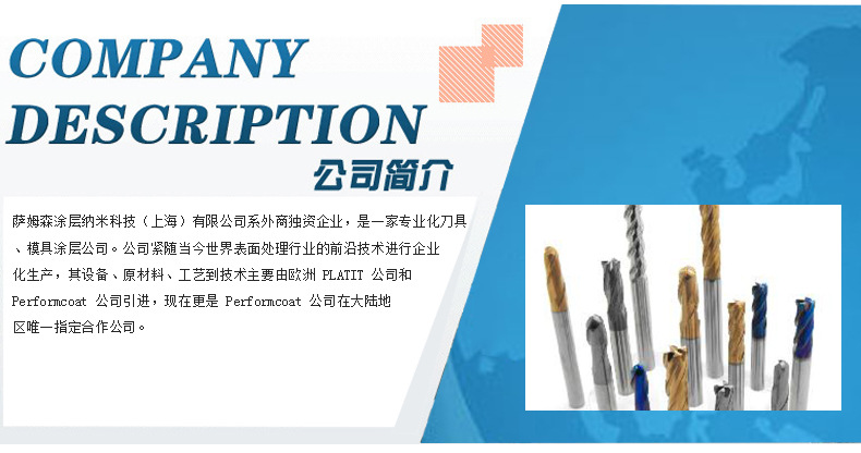 萨姆森涂层纳米科技(上海)有限公司系外商独资企业,是一家专业化刀具、模具涂层公司。公司紧随当今世界表面处理行业的前沿技术进行企业化生产,其设备、原材料、工艺到技术主要由欧洲PLATIT 公司和Performcoat 公司引进,现在更是Performcoat 公司在大陆地区唯一指定合作机构。 公司目前现有的设备采用了国内外先进的“动态磁控阴极电弧和矩形电弧靶”涂层技术,涂层具有光滑、致密、硬度高、耐高温、耐磨损、抗氧化以及附着力强等特点,并且涂层性能稳定可靠,均匀一致。涂层可以大幅度提高刀具、模具与摩擦磨损件的使用性能和寿命。涂层刀具主要用于航空、汽车和模具工业中钛、镍铝合金以及不锈钢和高强度模具钢等难加工材料的加工。 目前推出的涂层主要有TiAlN,AlTiN,ALTiCN, TiCN,TiN,CrN,CrC,TiAlCrN,ALTiSiN,TiSi,AlTiCN,AlCrN 等相关涂层。针对客户的不同需求我们会给您提供合理化的涂层建议,当然我们也一直在努力进行新型涂层的研发和市场推广强大的团队实力为您的诉求提供保障。我们的涂层适用于各种钻头、铣刀、燕尾槽刀、切槽锯片、环形锯片、扩孔刀等切削刀具及各种精密模具、冲头,应用及其广泛。金属表面经过涂层处理,不仅均匀光滑,而且硬度较之喷涂前可提高4-10 倍,并可重复喷涂,大大增强工件的耐磨性、抗粘性,从而达到延长使用寿命降低成本的目的。 主要客户群及相关镀膜产品: 1.切削工具业:如钻头,铣刀,螺齿刀,拉刀,圆锯片,舍弃式刀片等工具。 联系人:彭维旭 手机:15962454244 15962264744 电子邮箱:353459639@qq.com 3348916088@qq.com 地址:上海市嘉定区南翔镇惠平路77号6A厂房