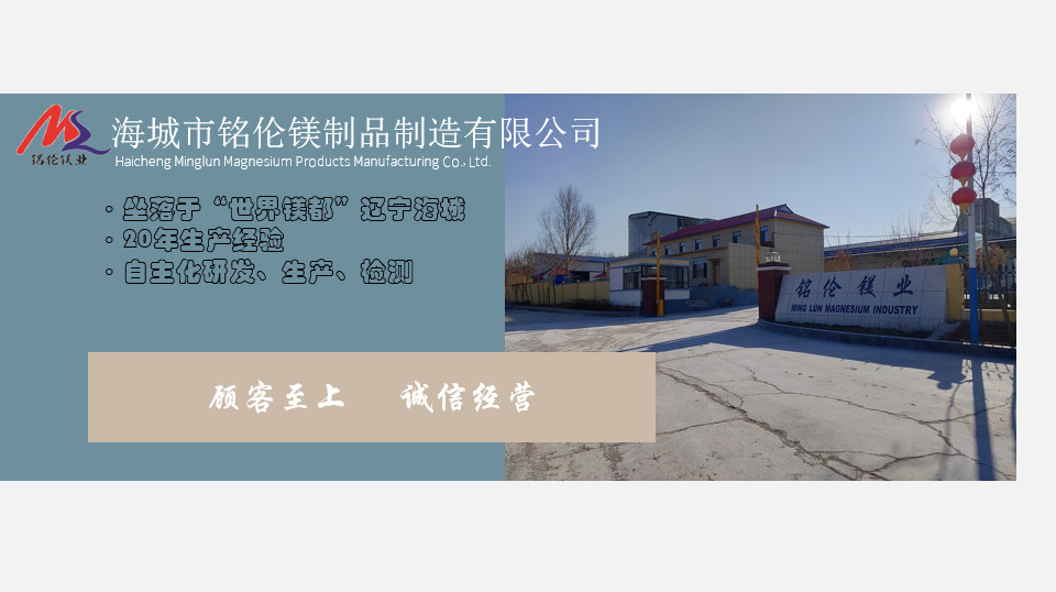 公司简介:铭伦镁制品制造有限公司,起始于1999年,拥有超过20年的生产经验。公司拥有自己的矿石储量,生产工厂,质检部门。