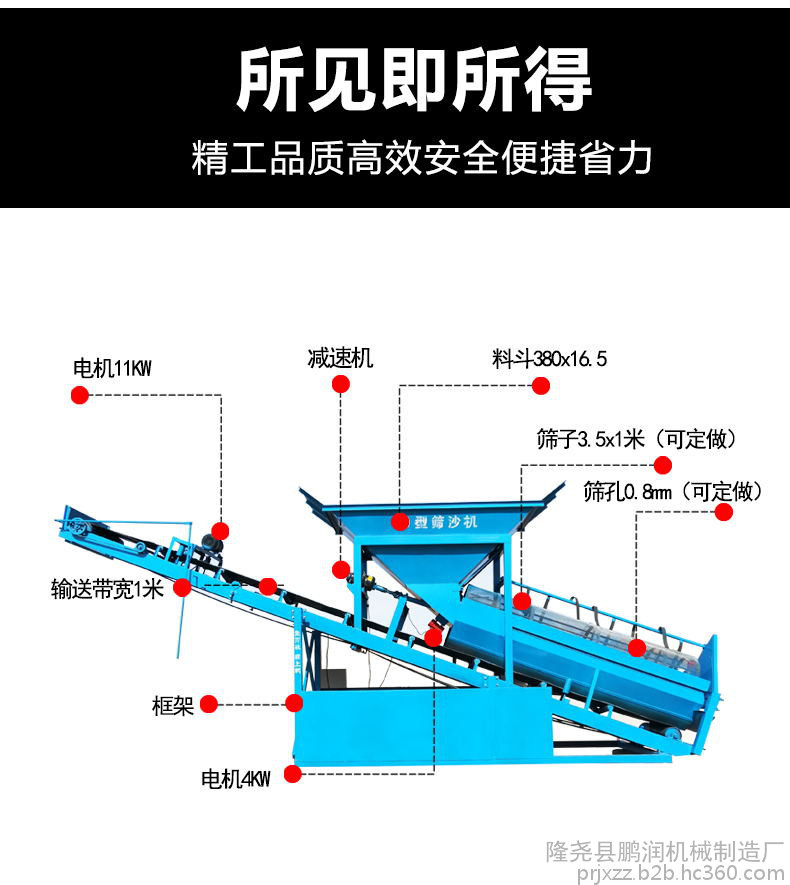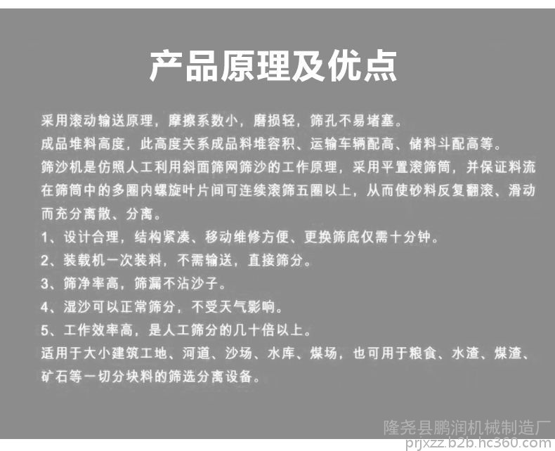 滚筒筛是由六角形滚筒、机架、漏斗、减速器、电动机五个部分成。破碎的石料进入滚筒后,一方面随着滚筒转动而被筛选,一方面粒度大的石料沿着滚筒的斜度向前流动,通过不同网目的的筛网逐渐被筛出。不大的石料筛出后落入各自的漏斗,然后由人工运出或自流送往成品堆。筛沙机是仿照人工利用斜面筛网筛砂的工作原理,采用平置滚筛筒,并保证料流在筛筒中的多圈内螺旋叶片间可连续滚筛五圈以上,从而使砂料反复翻滚、滑动而充分离散、分离;不同于斜置滚筛引起的大小料相互推挤、埋压,筛分过程匆忙;也不同于斜置振动筛的大小料振跳、混料。