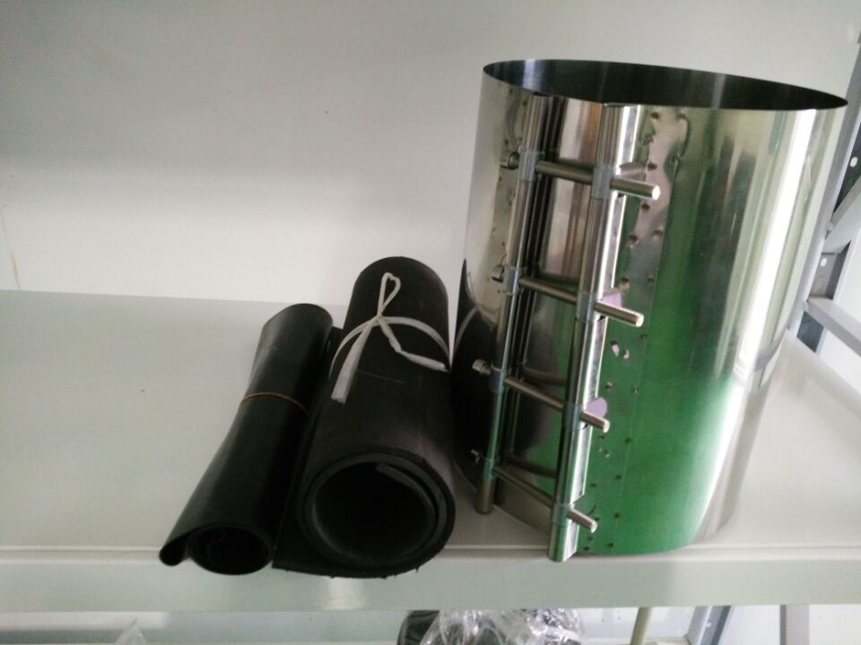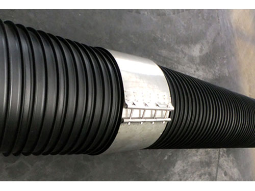 该种连接方式适用于塑钢缠绕管。连接结构由三层构成**内层薄壁橡胶套,紧套在管端起密封作用;中间层为一定厚度的具有良好弹性的发泡橡胶板,起填充作用,通过其充足变形能力可将外层不锈钢活套的紧箍压力均匀地传递到内层发泡橡胶板和橡胶套上,从而消除了管端表面不平整、肋片高度不均匀及椭圆度等因素对密封性能的影响;外层为开口不锈钢活套,通过活套上的紧固螺栓可调整活套对内层橡 胶套的紧箍力以确保密封,同时不锈钢活套可起到对管材连接部位的环钢度的补偿作用。