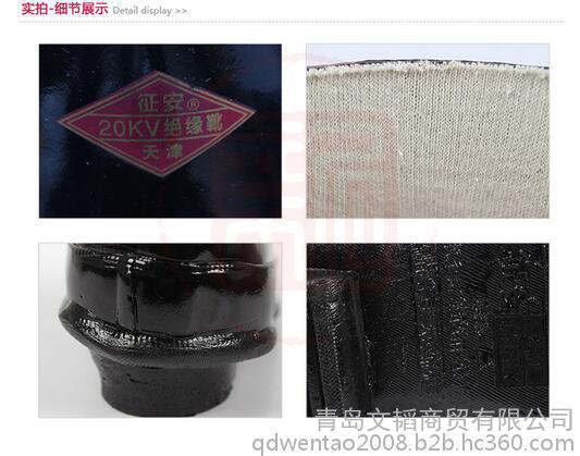 由天然橡胶加工而成,适用于电力电压器设备安装维修时使用,也可用于变电室工作环境; 其特点是绝缘性突出,耐老化,安全耐磨等,具有高性能的绝缘性和物理强度; 性能:可用作电厂电站等带电工作环境下使用。具有20KV绝缘功能。鞋内里棉布用纳米技术做成抗菌防臭功能; 靴高:26cm,帮高24cm; 颜色:黑色; 尺码:37-45。