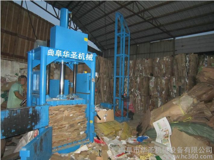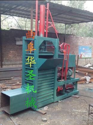 液压打包机包括支架,支架带有底板和前后侧挡板,支架上安装有千斤顶,千斤顶带有活塞杆,活塞杆右端连接有竖直的推料板,推料板右侧面连接有推料板条,相邻推料板条之间的空隙为板上穿绳槽;支架上面右部带有压料上挡板,压料上挡板左侧的支架上面带有进料口;前后侧挡板右侧的支架上分别固定连接有前后侧挡条,相邻侧挡条之间的空隙为穿绳口;支架右端带有出料口,出料口处的支架右端铰接有门板,门板左侧面连接有门板条,相邻门板条之间的空隙为门上穿绳槽;前后侧挡板、推料板和底板围成的空腔为进料腔,前后侧挡条、压料上挡板、门板和底板围成的空腔为挤料腔;门板和支架右端固定连接有锁定装置。并可根据需要在一定范围内调节打包的大小。
