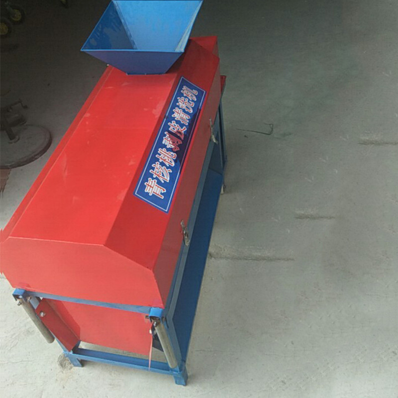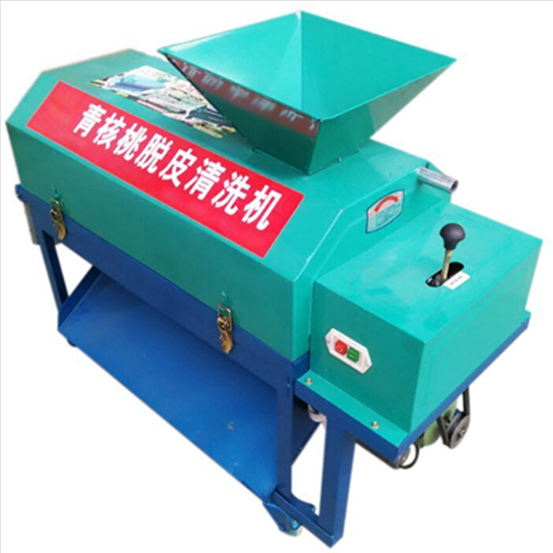新型青核桃脱皮清洗机主要包括机架部分,喂给部分:上下防护罩板,传动罩安全机构;单相电动机、三角皮带传动、变速箱等动力、水泵部分;旋切滚筒、调节格栅、钢丝毛刷等脱皮部分。