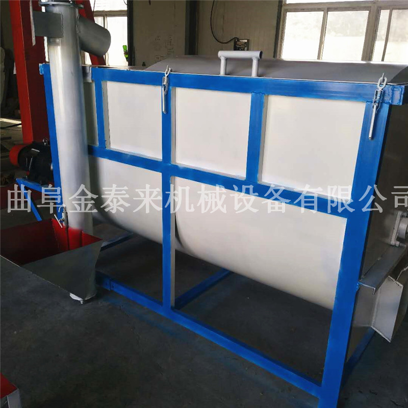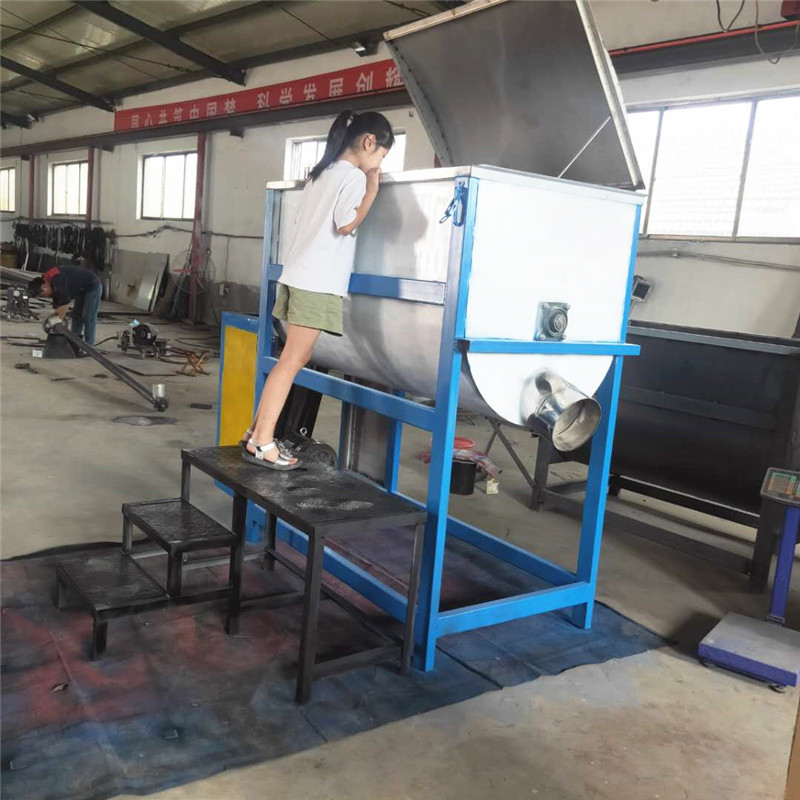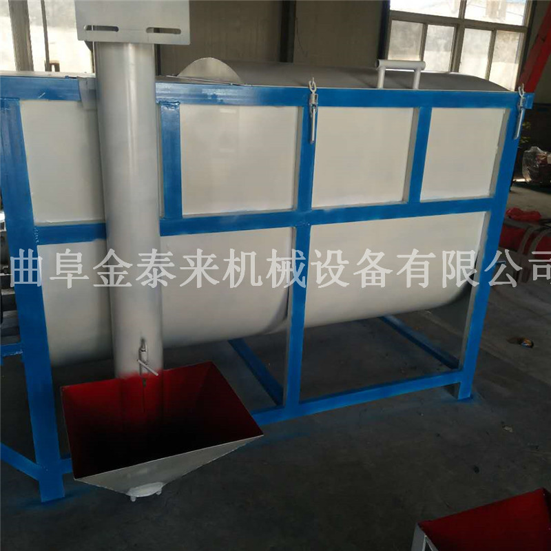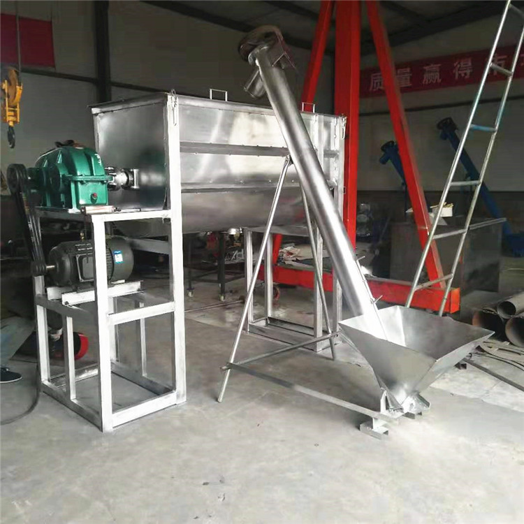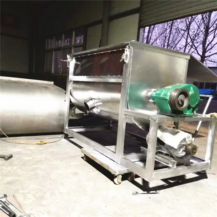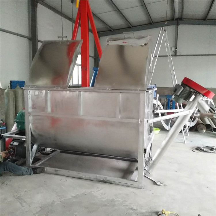 卧式 搅拌机的工作原理:卧式筒体内装有双轴旋转反向的浆叶,浆叶成一定角度将物料沿轴向、径向循环翻搅,使物料迅速混合均匀卧式混合机性能特点减速机带动轴的旋转速度与桨叶的结构会使物料重力减弱,随着重力的缺乏,各物料存在颗粒大小、比重悬殊的差异在混合过程中被忽略。激烈的搅拌运动缩短了一次混合的时间,更快速、更高效。 即使物料有比重、粒径的差异,在交错布置的搅拌叶片快速剧烈的翻腾抛洒下,也能达到很好的混合效果。混合均匀度高,残留量少。