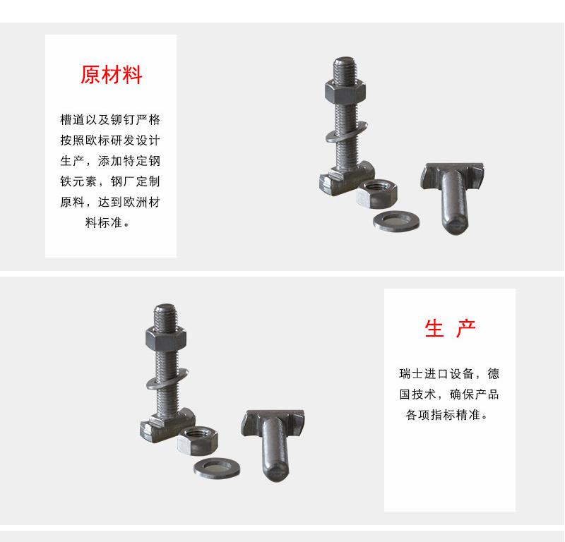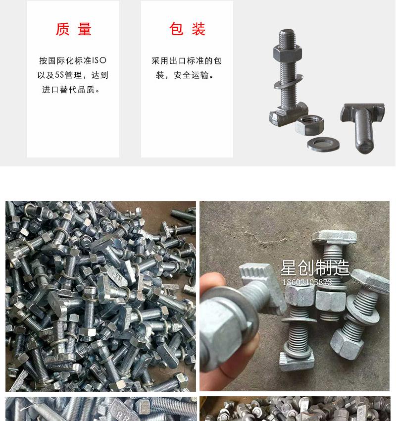 T型螺栓可直接放入铝型材槽内,在安装过程中它能自动定位锁紧,常与法兰螺母配合使用,是安装角件时的标准配套连接件,可根据型材槽宽和不同系列的型材来选择使用。T型螺栓属于活动性地脚螺栓。