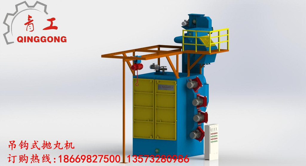 青岛青工机械专业制造吊钩式抛丸机:吊钩式抛丸机作为抛丸清理机的标准机型,其工作圆筒直径从900到1300 mm, 高度从1300 到2200 mm.标准机型带有2-7个抛头,最大承载量达10000公斤,这款抛丸机的生产效率相当高,灵活性跨度也相当大,是理想的清理强化设备,并且操作简便,只需将要处理的工件装载上机器,按下启动按钮,经过一个很短的时间(一般为5-7分钟),即完成了整个清理过程,清除掉所有粉尘和残余丸料。主要适用于各种中、大型铸件、锻件、焊件、热处理件的表面处理,包括易碎和形状不规则的工件。吊钩式抛丸清理机适合于铸造、建筑、化工、电机、机床等行业的中、小型铸、锻件的表面清理或强化处理,特别适合于多品种、小批量的铸件、锻件及钢结构件进行表面清理及抛丸强化,以去掉工件表面的少量粘砂、砂芯及氧化皮;亦适合于对热处理件的表面清理及强化;尤其适合于不宜碰撞的细长、薄壁件的清理。