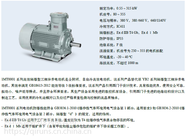 1MT0001系列电动机防爆性能符合GB3836.1-2010**性气体环境用电气设备**部分:通用要求》和GB3836.2-2010**性气体环境用电气设备第2部分:隔爆型"d"》的规定,防爆标志为Exd IIA T4 Gb、Exd IIB T4 Gb,适用于**性气体混合物存在的场所。