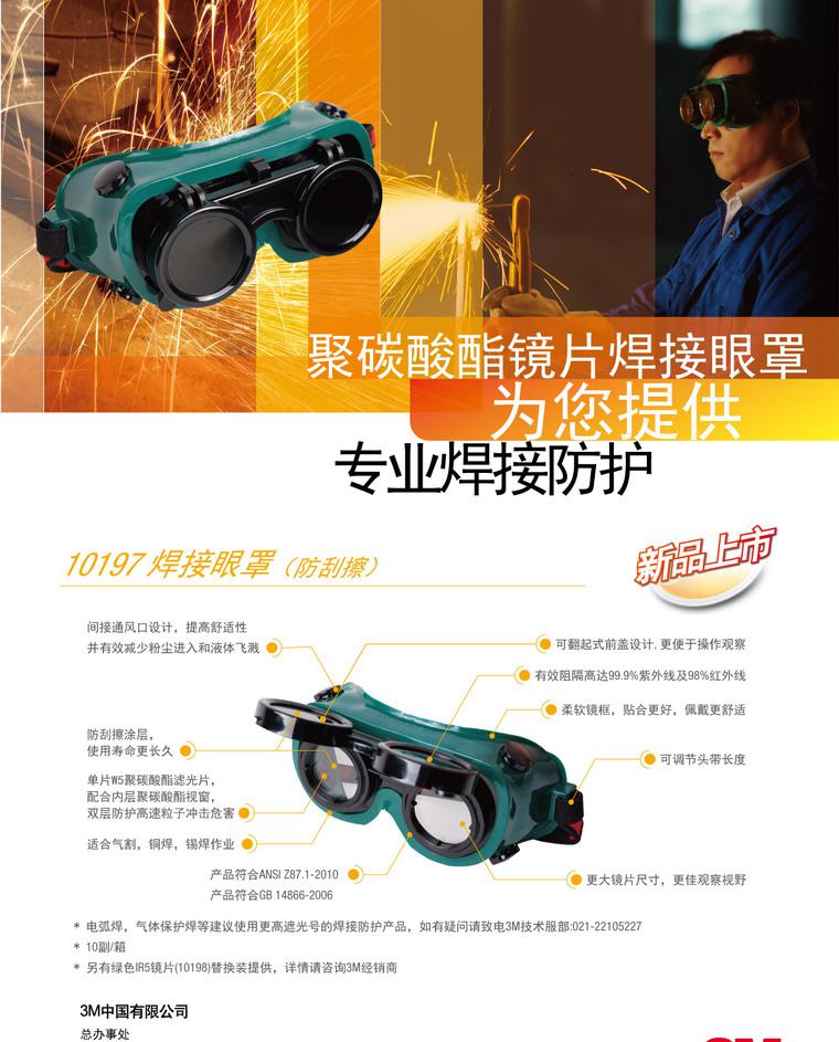 【性能】:3M 10197焊接防护眼罩采用可翻起式前盖设计,镜片易于更换,是现有中国市场少数直接使用带遮光号绿 5 IR5.0 聚碳酸酯镜片的焊接防护眼镜,有效阻隔99.9%紫外线及98%红外线;重量比普通玻璃镜片轻,防冲击效果极好; 镜片采取防刮擦涂层,能够有效延长镜片使用寿命;可调节头带长度,佩戴更舒适。