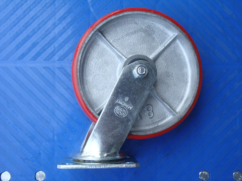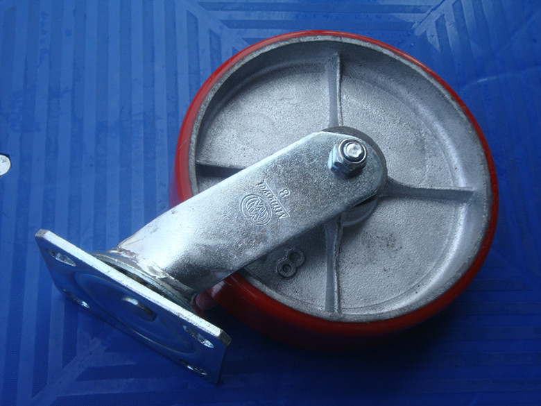 8寸铁心聚胺脂万向轮,单轮载重350KG,轮子总高245mm,轮片直径200mm,宽度50mm,底板尺寸115mmX100mm,安装孔距83mmX72mm,孔径11mm,快递费以买方实际路程为准,详情咨询店主。