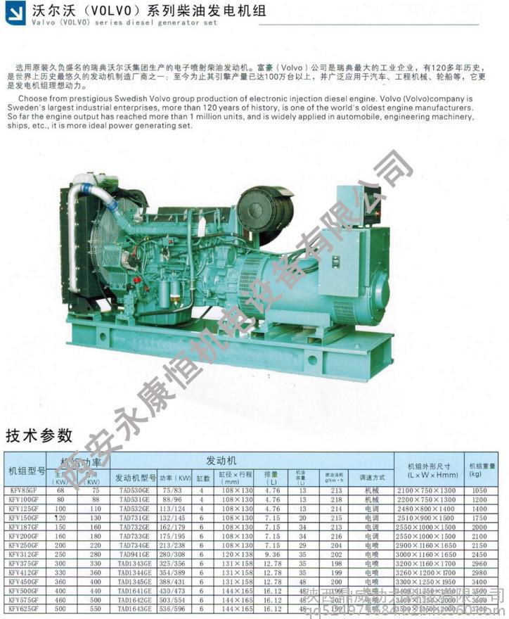 沃尔沃柴油发电机组具有耗油低、排放低、噪音小、结构紧凑等特点;此外,沃尔沃柴油发电机组具有高度的承受加载能力与快捷、可靠的冷启动性能; 工作平稳, 废气排放少,运行费用低,外观小巧;功率范围64KW-456KW。因沃尔沃柴油发电机组性能可靠、马力强劲、绿色环保、人性化的安全设计深得全球客户的青睐。