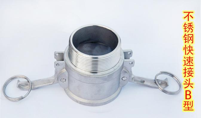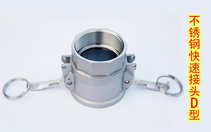 ??快速接头一般用于生产装备或储运系统的软管接合处,主要作为清扫或杂用的临时接管用,也可作为灭火、燃汽、水、惰性气体的快速连接。其结构采用偏心原理实行制动锁紧,整体压制成型,外形美观,耐腐蚀性安全可靠,易于操作。还可根据各种实际情况,同种规格的A、B、C、D中任意型号,均可与E、F、DC、DP中任意型号组成接头体。A型快速接头是一个公头,它两边没有拉耳,它一头的连接是与有拉耳的母头直接卡的,另一头则是内螺纹连接。