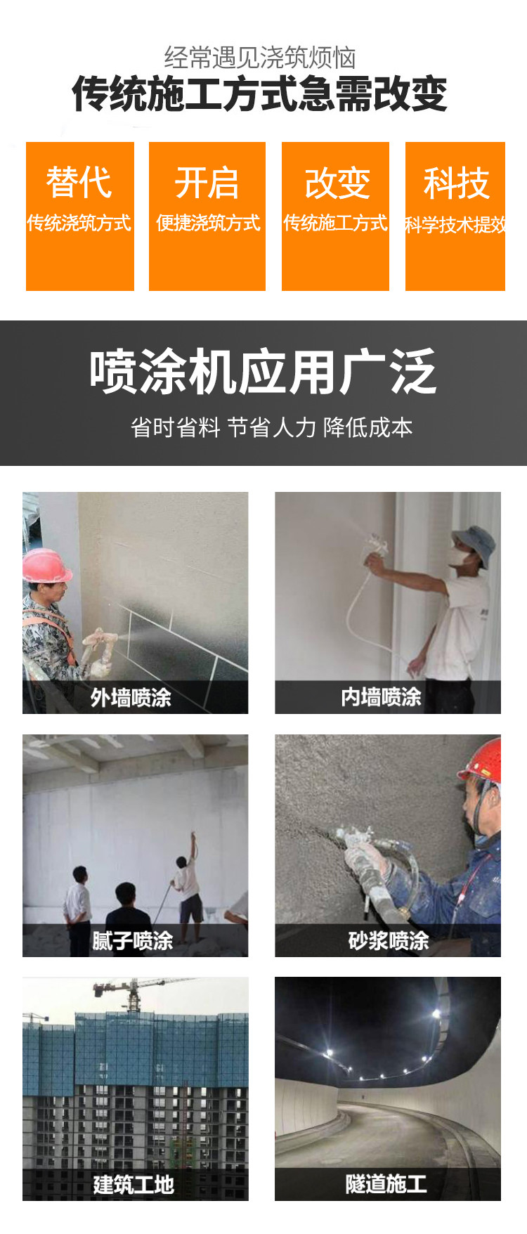 使用砂浆喷浆机基本没有落地灰、省水、省料,可大降低成本,操作简单,无需搭脚手架,不用移动设备,不用修补搭茬,阴阳角、顶板均能自由喷涂,具有速度快,效率高,劳动强度低,一台多功能喷涂机每小时可轻松喷涂200平方米面积。设计合理、泵和压缩机一体化,移动方便。