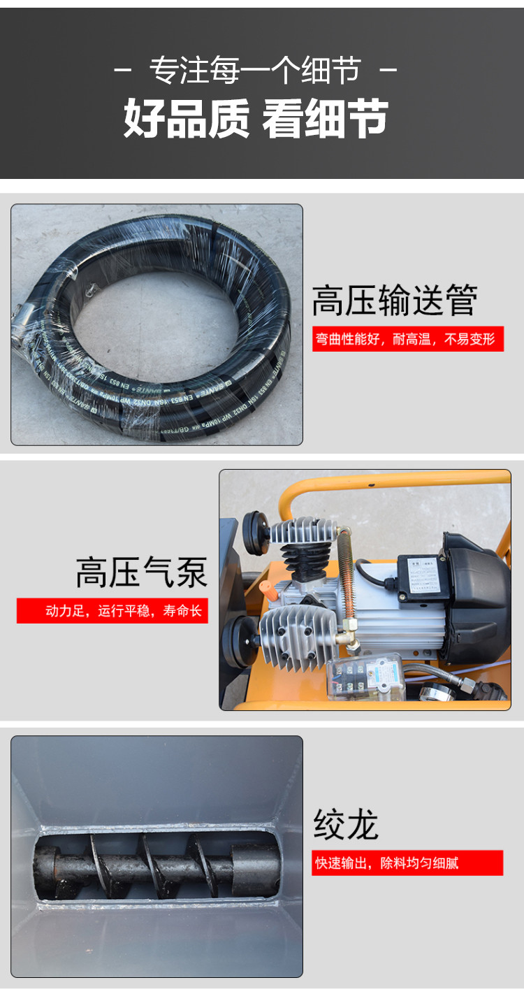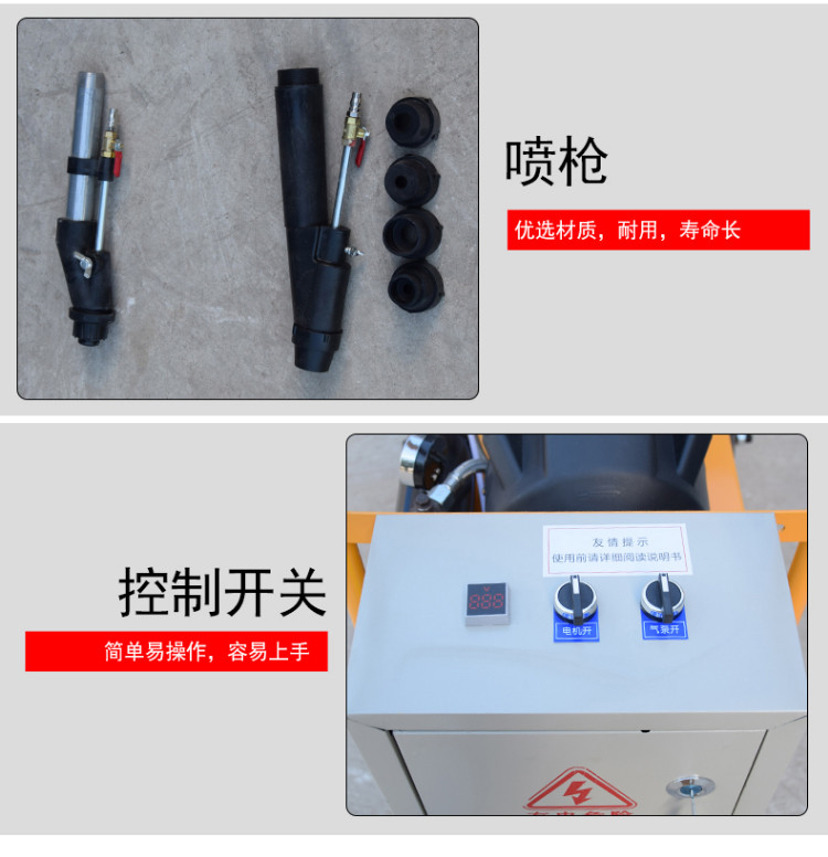 使用砂浆喷浆机基本没有落地灰、省水、省料,可大降低成本,操作简单,无需搭脚手架,不用移动设备,不用修补搭茬,阴阳角、顶板均能自由喷涂,具有速度快,效率高,劳动强度低,一台多功能喷涂机每小时可轻松喷涂200平方米面积。设计合理、泵和压缩机一体化,移动方便。