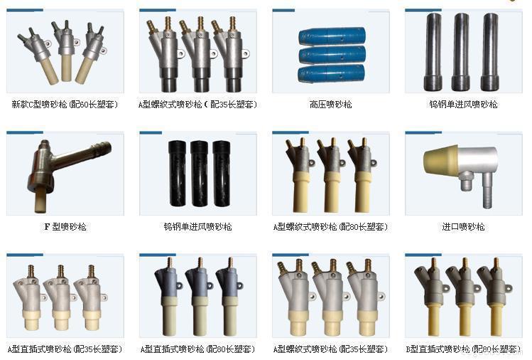 **的为碳化硼喷沙枪,使用寿命一般为500-700小时。 其次是碳化钨及合金钢使用寿命一般为300-400小时,价格一般 铁只能用10几小时,现在已经很少有人使用了。