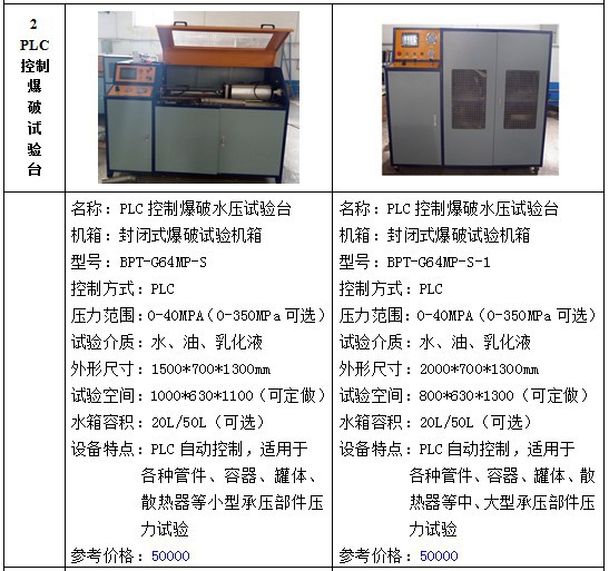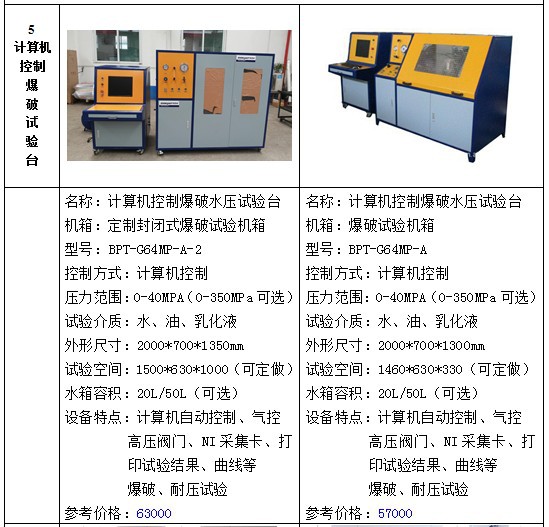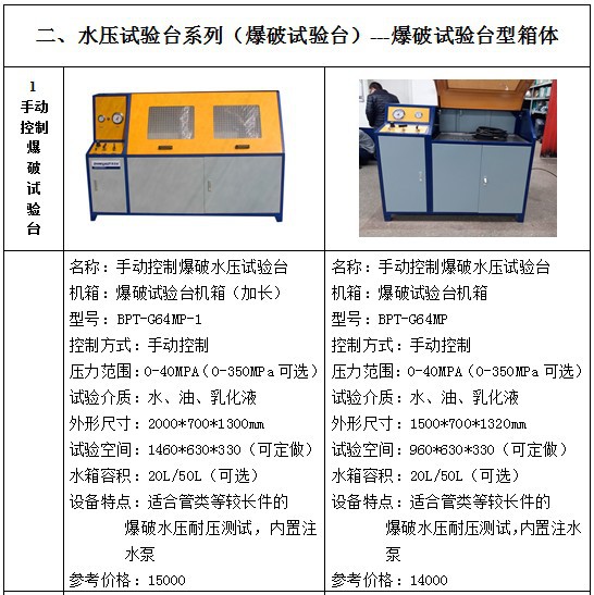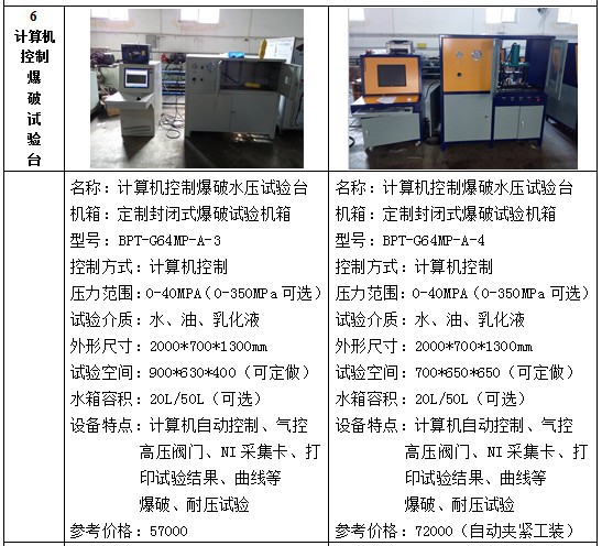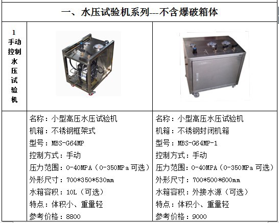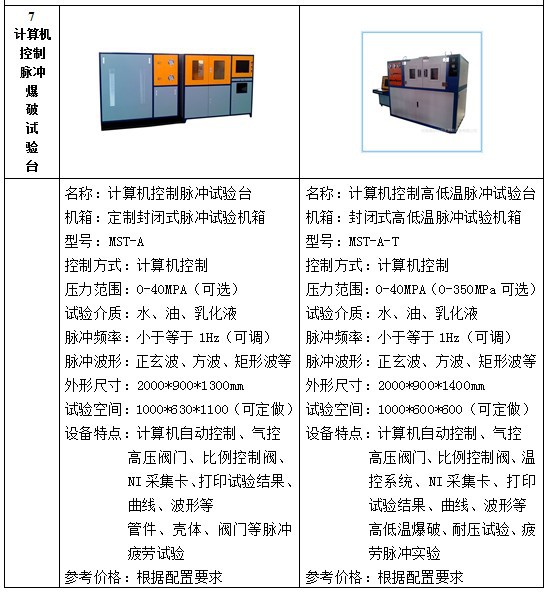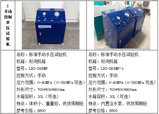 水压试验设备包括:试压泵、水压试验机、耐压试验台、爆破试验台、疲劳脉冲实验台、高低温试验台、气瓶外测法水压试验台