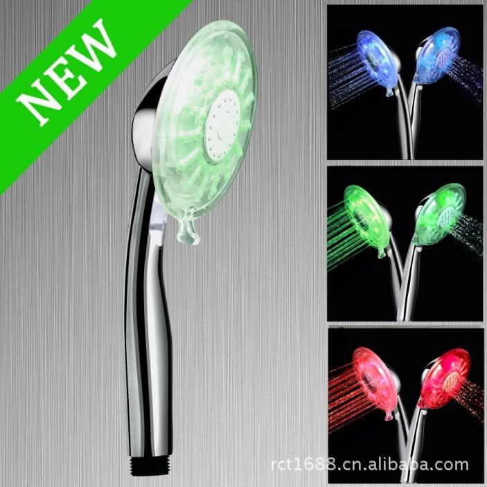 3、根据水的温度变化颜色。当水温在当水温≤28℃时,灯会发蓝光,当水温在29℃~36℃的时候LED灯会发绿光,当水温在37℃~43℃时LED灯会发红色的光,水温在≥44℃以上则LED灯会红色闪烁.