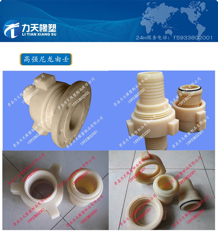 经质量检测部门检验合格的金属由壬相比具有质量轻、耐磨、耐酸碱腐蚀等特点尼龙由壬规格,我们仿照SPM、FMC公司锻钢由壬的结构的基础上生产出了结构独特的尼龙由壬,其两端可以和金属管冲击强度(kJ/m2) 60-00,线性膨胀系数与制品的设计有密切关系,线性膨胀系数较大的品种,杂实际使用中将会导致PV值的降低,从而影响其耐磨性,尼龙66的线性膨胀系数较低,略高于尼龙6,低于其它尼龙品种。,产品结构:尼龙高压油任的材料 让客户放心使用尼龙高压油任包括三部分:尼龙翼形螺母、阴头连接件、阳头连接件(一般在阳头上添加橡胶密封件,橡胶的材质可根据输送介质选型),2.自润性、耐摩擦性好。尼龙具有很好的自润性,摩擦系数小,从而,作为传动部件其使用寿命长。、玻璃钢管、PPH管及橡胶软管对接。