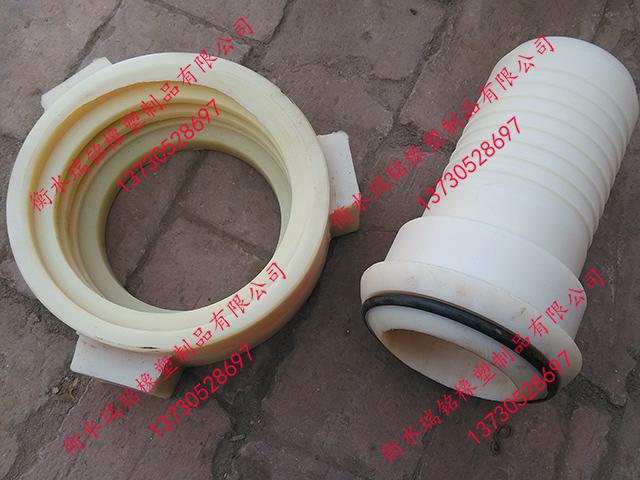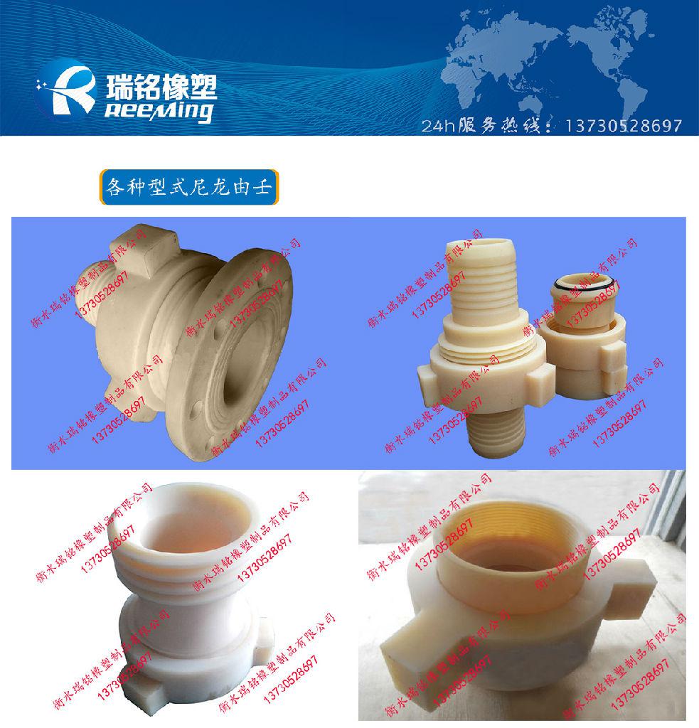 瑞铭橡塑专业生产的尼龙由壬,其与金属由壬相比具有质量轻、耐磨、耐酸碱腐蚀等特点,我们仿照SPM、FMC公司锻钢由壬的结构的基础上生产出了结构独特的尼龙由壬,其两端可以和金属管、玻璃钢管、PPH管及橡胶软管对接。当尼龙由壬和橡胶软管连接时不能再用扣压结构,只能用管箍紧固;和硬管连接时,尼龙由壬具有和锻钢由壬一样的英制管螺纹方便连接。