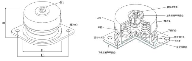 ZD型阻尼弹簧减震(振)器又叫水泵减震器或空调减震器,材质分为普通铸铁及球磨铸铁球,该型减震器具有弹簧减振器的低频率和橡胶减振器的大阻尼等双重优点,将两点的优点结合,消除了弹簧减振器共振时振幅激增的现象,又解决了橡胶减振器固有频率较高的难题,是积极消极隔振的产品。