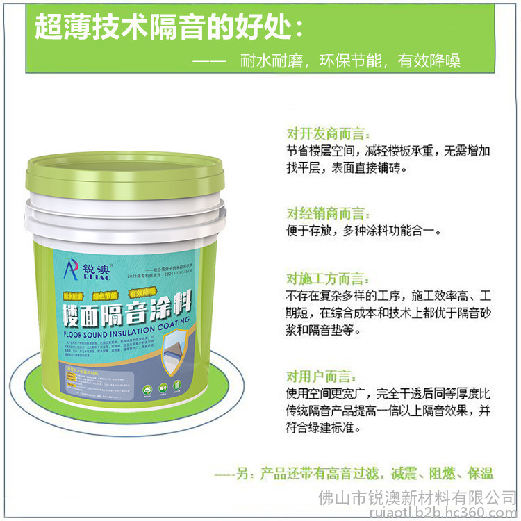 本产品有别于传统的隔音砂浆,它施工简单、每平方用量少、隔音效果佳,同时具有超薄全效技术,大大有利于开发商、经销商、施工方及用户的楼层隔音需求。另外:产品水性环保、耐水耐磨、高附着、微弹性强减震,通用基材广,质量符合标准和地方绿建验收标准。