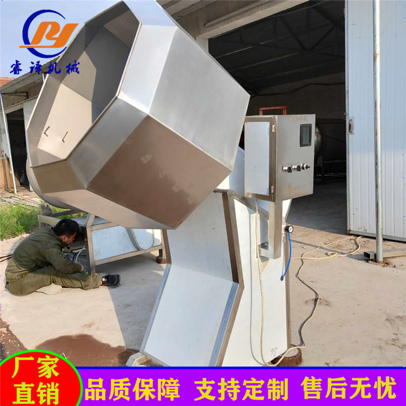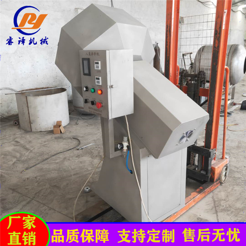 八角拌料机也称八角筒拌料机,是一种将多种物料在一起混合旋转搅拌的机器,适用于食品生产过程中对块状、片状、颗粒状食品的上粉、调味、加料、拌料、挂浆以及食品加工后期调味粉的搅拌或原料的裹粉包衣以及掺和专用,结构简单实用,焊接牢固,表面光亮,桶体为不锈钢八角型设计,能在较短时间内使待加工食品物料与所需调料充分拌合均匀,自动出料,清理消毒方便无死角。