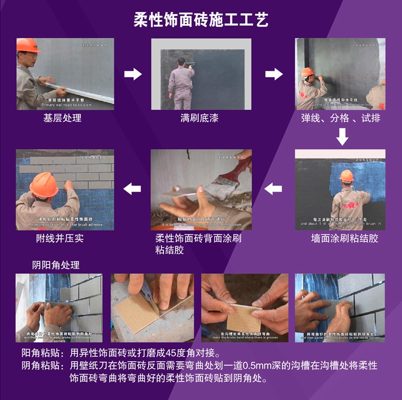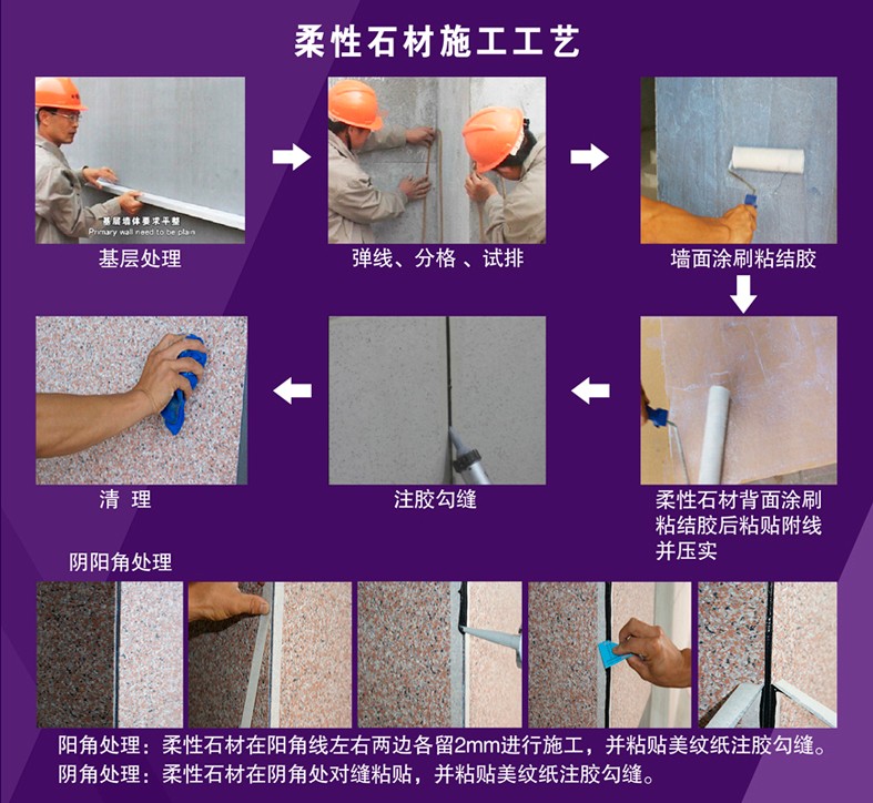 4)、阳角粘贴:阳角粘贴时,柔性石材在阳角线左右两边各留2mm进行施工,预留处以便注胶勾缝。