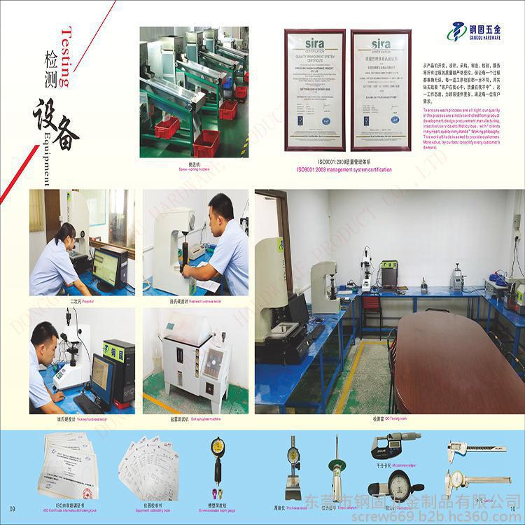 钢固自成立以来**拥有完善的质量控制体系,独立现代化检测实验室(维氏硬度计,洛氏硬度计,投影仪,盐雾测试机,二次元,拉推力计,扭力计)等齐全的检测设备,通过ISO9001质量管理体系认证,要求全员参与推进ISO程序。