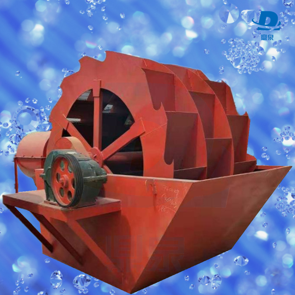 轮斗洗砂机工作时,动力装置通过三角带、减速机、齿轮减速后带动叶轮缓慢转动,砂石由给料槽进入洗槽中,在叶轮的带动下翻滚,并互相研磨,除去覆盖砂石表面的杂质,同时破坏包覆砂粒的水汽层,以利于脱水;同时加水,形成强大水流,及时将杂质及比重小的异物带走,并从溢出口洗槽排出,完成清洗过程。