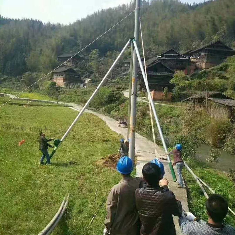 铝合金立杆机说明:立杆机分为抱杆立杆机和三脚架立杆机,抱杆又名人字立杆机,铝合金框式立杆机。三脚架立杆机适用于立杆、起吊下轴电缆,钢绞线等货物,他的特点主材采用高强铝合金,安全可靠,自重轻。适用于立杆、起吊下轴电缆,钢绞线等货物。三脚架立杆机体积小,重量轻,应用灵活,方便保险,系数高,解决了吊车不能进行的产地及人工立杆危险性的难题整套立杆过程只需几个人在短暂的十几分钟内完成。