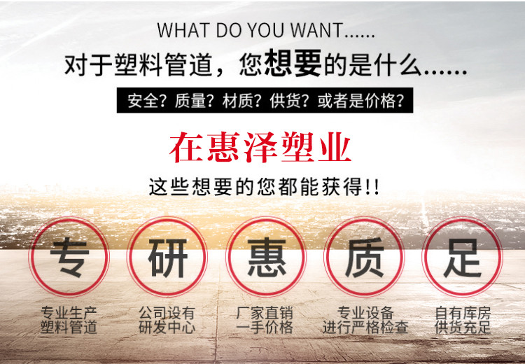 山东惠泽塑业有限公司,主要生产PE管道、电缆保护管MPP,CPVC,PE给(排)水管材(件),U-PVC、PP-R排水管等。生产基地位于山东临沂。