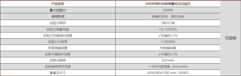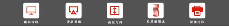 【适用范围】 5000N微机控制弹簧拉压试验机是按照国标准机其他相关标准的弹簧试验规范而设计制造的专用测试设备。 针对各类本机型量程范围内的拉伸弹簧、压缩弹簧、螺旋弹簧、圆柱弹簧、减震弹簧、汽车弹簧、中小碟簧、膜片弹簧、气弹簧、模具弹簧、异形弹簧、弹性元件等的拉力、压力、位移、刚度(弹性系数)K、弹性模量、回弹力等强度试验和分析。该弹簧试验机主要用于弹簧制造厂、电器制造厂、汽车生产厂等弹簧生产厂家及弹簧使用单位的弹簧抽检、批量检测及分选和各类大专院校、科研部门、质监部门等相关项目的检测。 如螺旋弹簧: 1、通过弹簧的变形量△H、或者压至高度H测量对应的力值F来判断弹簧是否合格。 2、通过弹簧的力值F,来测量对应的弹簧变形量△H或者高度H来判断弹簧是否合格。 3、可进行一点或者多点测试判断弹簧是否合格。 4、可进行分段测量,并能计算出每段的刚度(弹性系数)K和平均刚度。 5、可对产品进行抽样检查,也可以进行批量测试(机械部分具有批量测试工装)。 【相关标准】 产品依据 《JB/T 7796-2017弹簧拉压试验机》 试验方法 《GB T 1239.1-2009冷卷圆 拉伸弹簧》试验方法 《JIS B7738-2001螺旋弹簧压力、拉力试验机》等规定的技术要求 等相关标准设计。(其他标准咨询电话:13153018135) 【仪器特征】 5000N微机控制弹簧拉压试验机由电脑控制完成弹簧的整个循环测试流程,可单独测定弹簧某个参数,出具试验曲线,并可打印出试验报告。 用户在使用中可根据实际需要调整测试程序,操作极为方便。 试验机主机与辅具的设计借鉴了国外的先进技术,外形设计合理美观,操作方便,性能稳定可靠。计算机系统通过中试springteststart控制器,经调速系统控制电机转动,经减速系统减速后通过精密丝杠副带动压盘上升、下降,实现试验力、试验力峰值、横梁位移、试验变形屏幕显示,完成试样的压缩、拉伸等力学性能试验。 相关产品:20KN数显全自动弹簧试验机 高低温弹簧拉压试验机 微机控制弹簧扭转试验机 弹簧拉压疲劳试验机