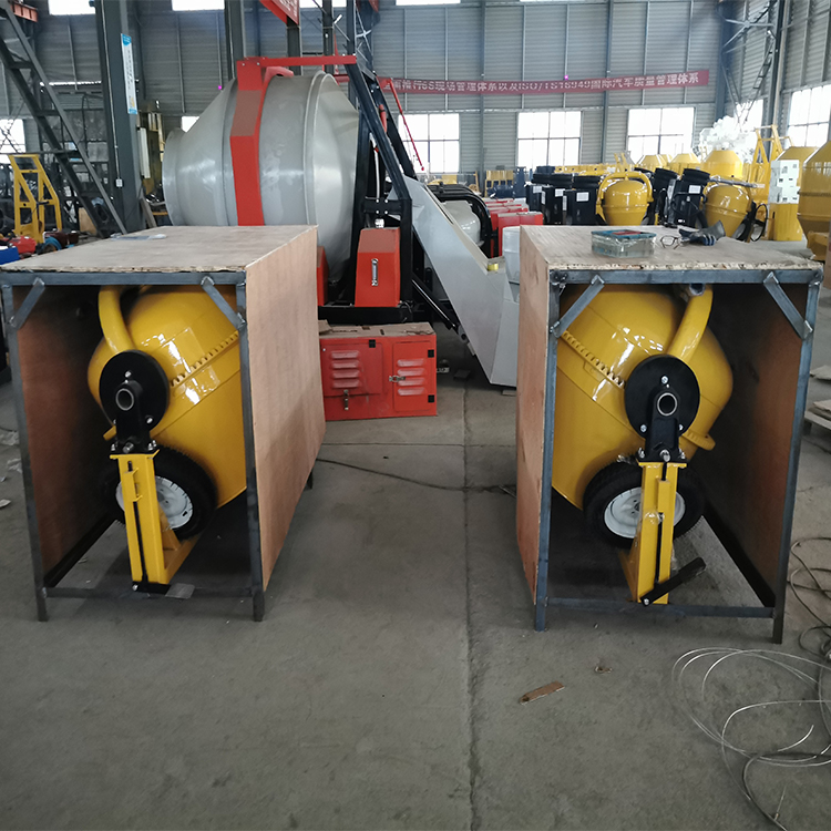 本机搅拌机构由搅拌筒、托轮和传动系统组成。搅拌筒是搅拌机的工作部件,搅拌筒为双锥形,筒体内焊有两对高低片,交叉布置,分别与拌筒轴线成一定夹角,搅拌筒旋转时,叶片在使物料提升下落的同时,还使物料轴向回窜动,所以搅拌运动比较强烈,搅拌35-45秒即可达到匀质混凝土。在搅拌筒的出料锥体内部,焊有一对出料叶片,改变搅拌筒旋转方向,混凝土即由底叶片推向出料叶片并排出筒外。