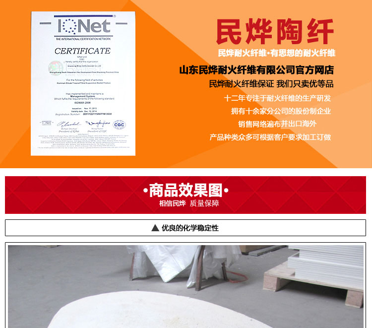 山东民烨耐火纤维有限公司是一家专业从事陶瓷纤维材料的研制开发、生产经营及施工于一体的股份制企业,下属淄博民烨耐火纤维有限公司淄川分公司、淄博民烨耐火纤维有限公司微山分公司、淄博民烨耐火纤维有限公司工程公司、淄博民烨耐火纤维有限公司销售公司、怀仁县昌元陶瓷原料有限公司。 公司现有陶瓷纤维甩丝生产线19条,喷吹生产线4条、纤维毡、板半自动生产线10条,纤维毡、板自动流水生产线4条,船舶专用轻质耐火纤维毡、板、墙体房顶防火保温轻质板生产线2条。我公司陶瓷纤维系列产品主要有棉、毡、毯、纸、绳、布、折叠块、模块、晶体纤维等品种;温度为:普通型、标准型、高纯型、高铝型、低锆型、含镐型、晶体型等级别,总产量达6万余吨。产品销往出口多个地方,受到客户朋友的好评。
