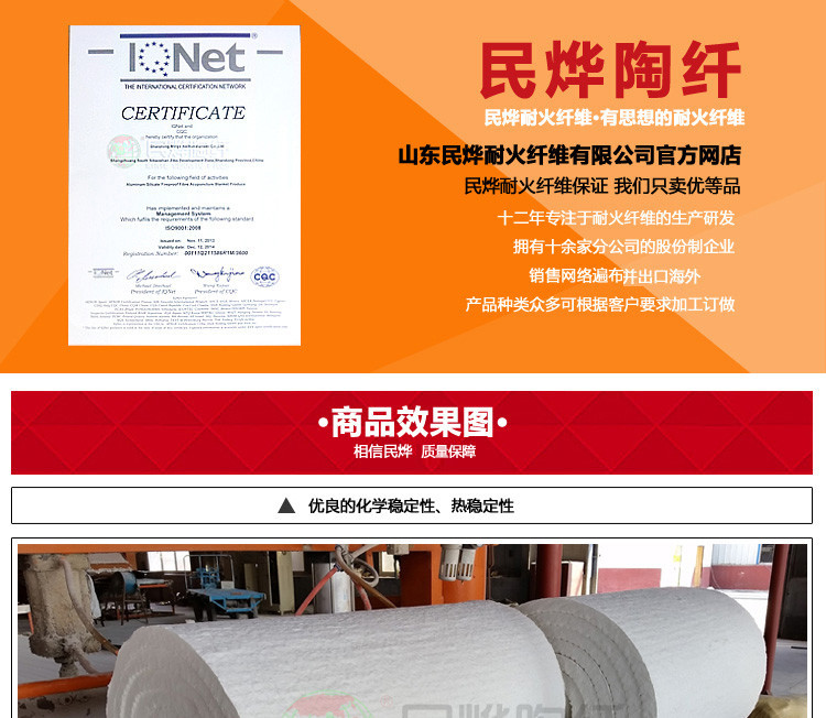 山东民烨耐火纤维有限公司是一家专业从事陶瓷纤维材料的研制开发、生产经营及施工于一体的股份制企业,下属淄博民烨耐火纤维有限公司淄川分公司、淄博民烨耐火纤维有限公司微山分公司、淄博民烨耐火纤维有限公司工程公司、淄博民烨耐火纤维有限公司销售公司、怀仁县昌元陶瓷原料有限公司。 公司现有陶瓷纤维甩丝生产线19条,喷吹生产线4条、纤维毡、板半自动生产线10条,纤维毡、板自动流水生产线4条,船舶专用轻质耐火纤维毡、板、墙体房顶防火保温轻质板生产线2条。我公司陶瓷纤维系列产品主要有棉、毡、毯、纸、绳、布、折叠块、模块、晶体纤维等品种;温度为:普通型、标准型、高纯型、高铝型、低锆型、含镐型、晶体型等级别,总产量达6万余吨。产品销往出口多个地方,受到客户朋友的好评。