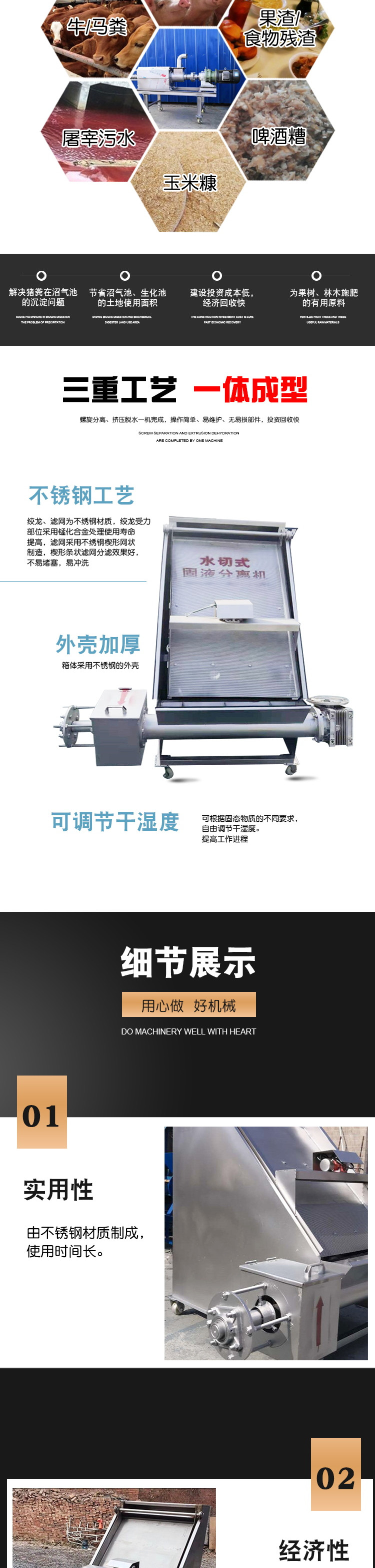 实用性:该系列机渣液分离速度快,经分离后的粪渣含水量在30-40%之间,出渣量及含水量可调整,可适用不同成份的饲料(如草及精饲料),便于运输,其固粒物很适合作为鱼饲料和有机肥的原料等。