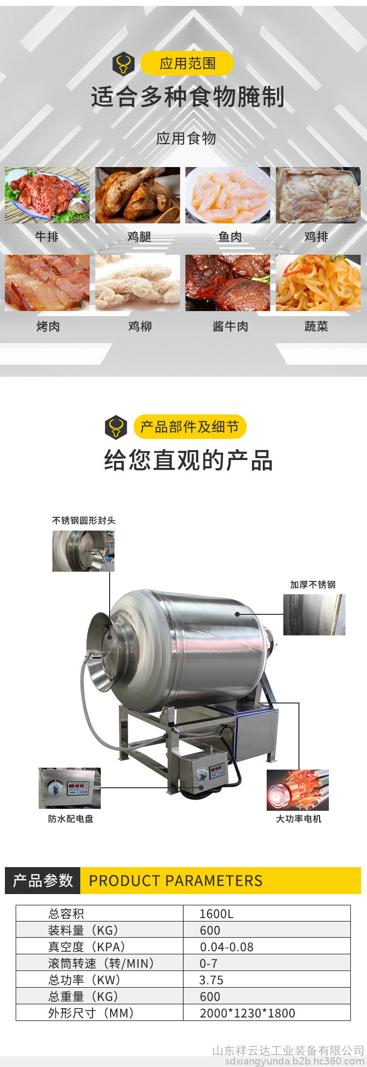2、客户可以选配采用变频无级调速,速度范围1-7转;可以选择好的加工工艺,提高生产效率;节约能耗;启动平稳,降低机器启动时的冲击,延长设备使用寿命。选择低速功能适用多种滚揉易变形产品,特别是禽类和渔产品。