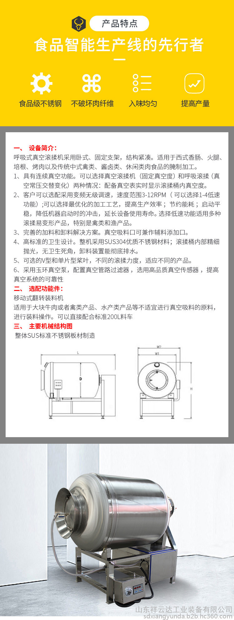 产品特点:食品智能生产线的先行者(食品级不锈钢 不破坏肉纤维 入味均匀 提高产量)