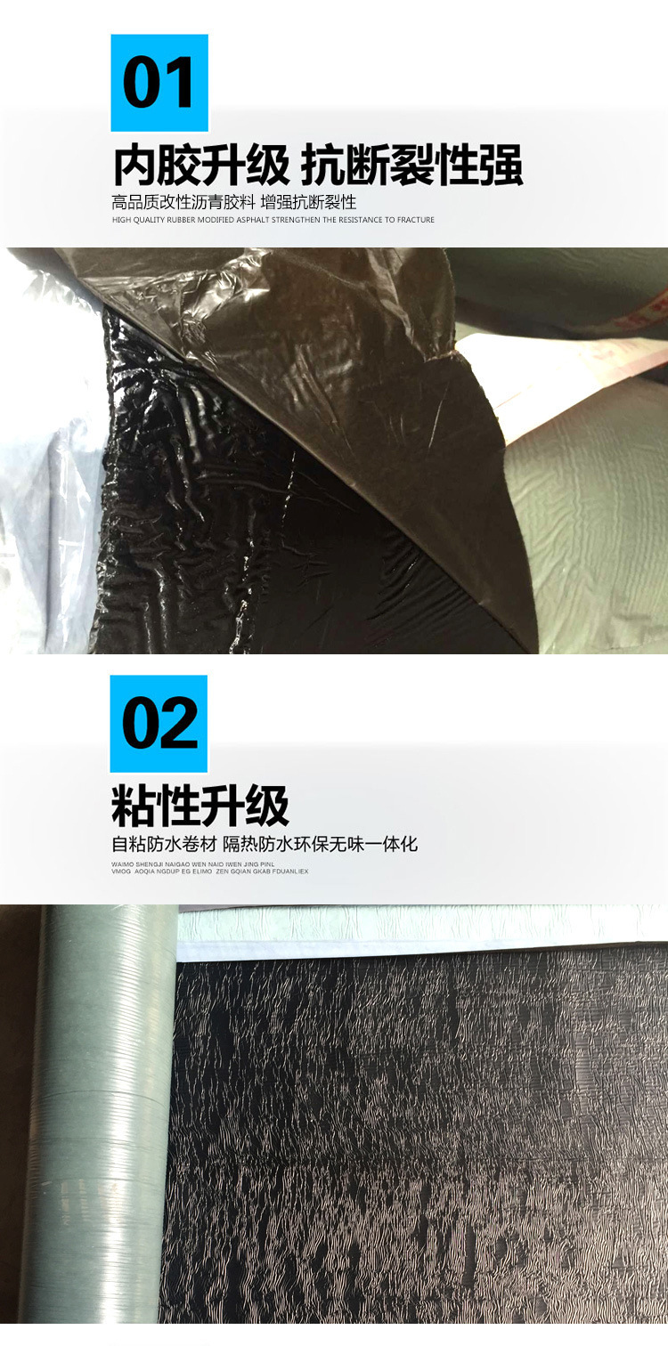 该材料是由增强胎体、高品质的改性沥青胶料和含有CaSiO3的自粘胶料复合而成的新型防水卷材。具有。施工便捷,节省工期、粘结可靠,避免窜水、预铺粘结,安全环保的特点。
