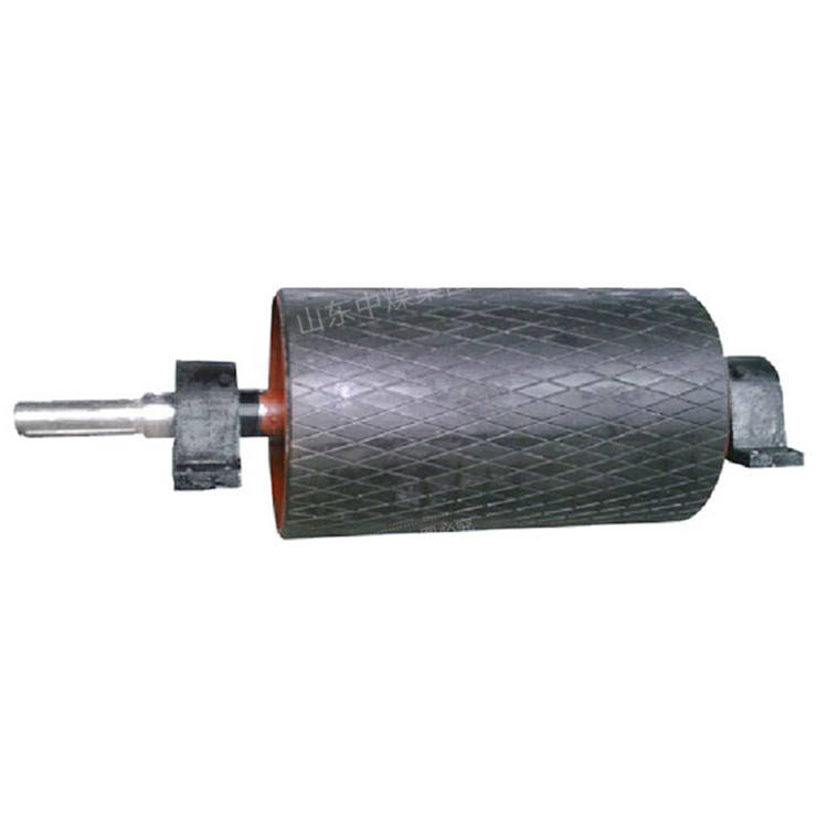 输送机的传动滚筒结构有钢板焊接结构及铸钢或铸铁结构,驱动滚筒的表面形式有钢制光面滚筒、铸(包)胶滚筒等,钢制光面滚筒主要缺点是表面摩擦系数小,一般用在周围环境湿度小的短距离输送机上。铸(包)胶滚筒的主要优点是表面摩擦系数大,适用于环境湿度大、运距长的输送机,铸(包)胶滚筒按其表面形状又可分为光面铸(包)胶滚筒、人字形沟槽铸(包)胶滚筒和菱形铸(包)胶滚筒。