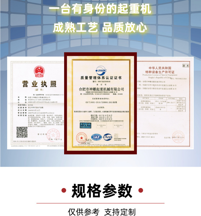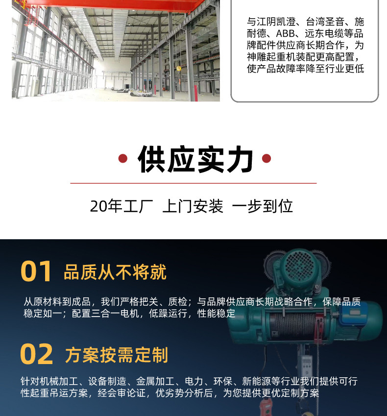 采购5吨电动葫芦双梁行车起重机,请认准21年实力大厂【神雕起重】——中铁上海局合作供应商;20余年行业经验,交货周期短、专业运输团队、上门安装、包验收,可根据您车间情况,进行非标定制。