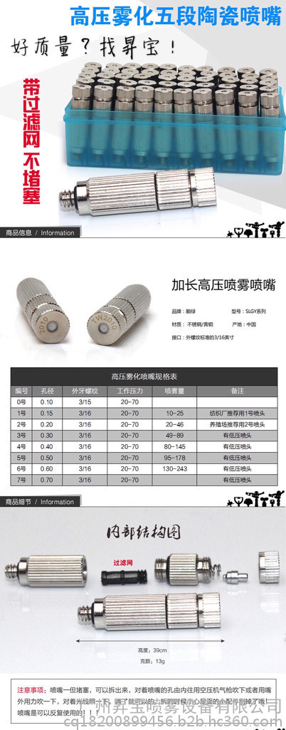 高压雾化喷嘴,又称高压精细雾化喷嘴,以黄铜或不锈钢为主体,内镶不锈钢喷嘴芯和不锈钢导流叶片,内含防滴漏装置。液体在10Kg-70kg的水压之下,高速流动,在导流叶片中形成一个离心旋涡,从高压雾化喷嘴喷孔中喷出极细微的空心式雾粒。高压雾化喷嘴使用特氛龙滩网,雾粒粒径仅为3-5微米,此种高压雾化喷嘴喷孔是使用美国精密打孔机打孔,孔径在0.1mm—0.5mm之间,高压雾化喷嘴的自由组合,可以有效的调节加湿量和喷雾效果。该高压雾化喷嘴的特点是不易堵塞,耐磨性好,喷雾均匀,可以有效的提高产品的质量和生产 效率,制作精良,使用成本低廉。同时我公司还生产和其配套使用的各种喷雾主机,高压管路件,如三通,单喷座,双喷座,直通,弯头,未端堵头等。