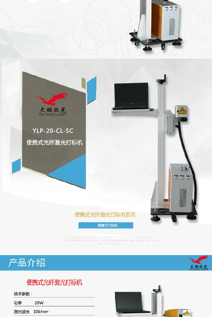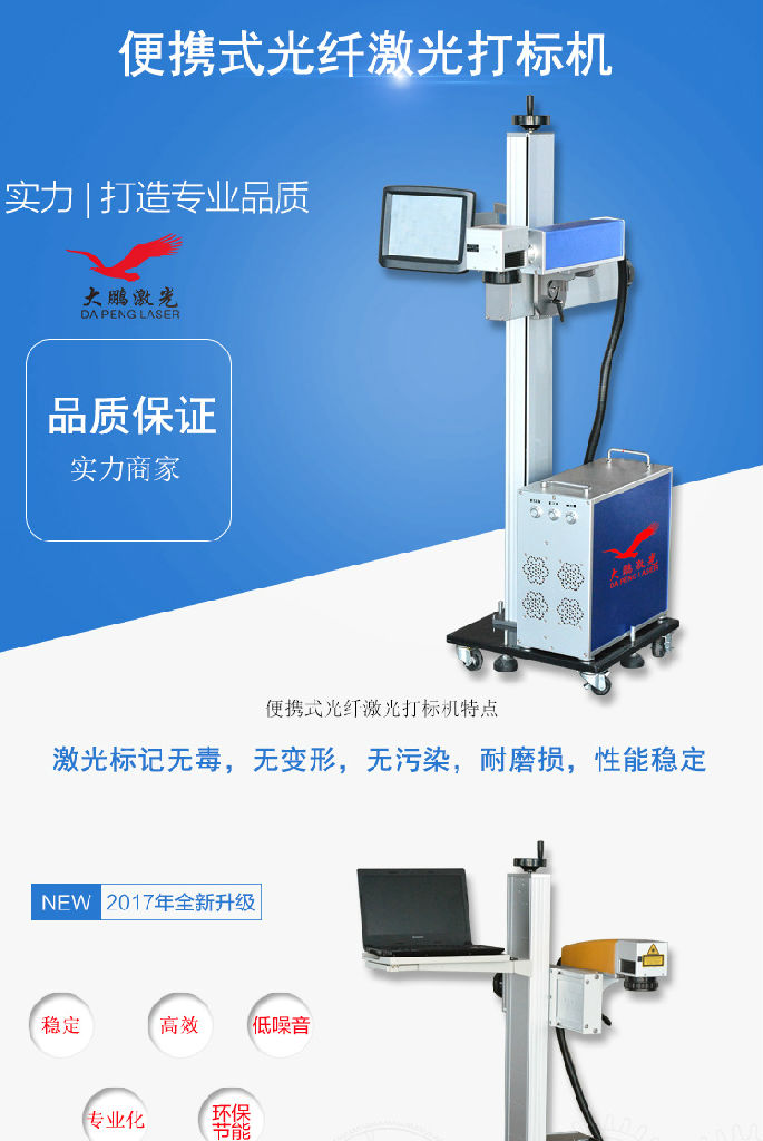 *激光标记无毒,无变形,无污染,耐磨损,性能稳定价格适中,可随意控制打标深度,能长期工作*采用一体化的设计结构,全新的光路密封方式总体稳定可靠,外形美观*继承了前几代固体激光打标机的成熟性和实用性并通过软件和控制系统的升级使得整机的稳定性得到进一步提高*可进行图形微标和文字等任意信息的标记,具有标刻图案精细美观,不磨损的特点机型特点:光纤飞行激光打标机具有光束质量好整机体积小,打标精度高,速度是传统机的3倍,平时不再换水,换灯,调整光路的烦恼寿命长达10万小时,无消耗材料,用户可以高枕无忧,放心使用,无污染,无噪音、节能省电,耗电量仅为传统激光机的1/25应有领域:广泛用用于精密机械、电子元件、通讯模具、钟表、眼镜、印刷、首饰、五金制品等行业、特别使用于不锈钢高速扫描、透光按键、位图雕刻、模具加工、印字轮雕等对深度、光滑度、精细度要求较高的领域。