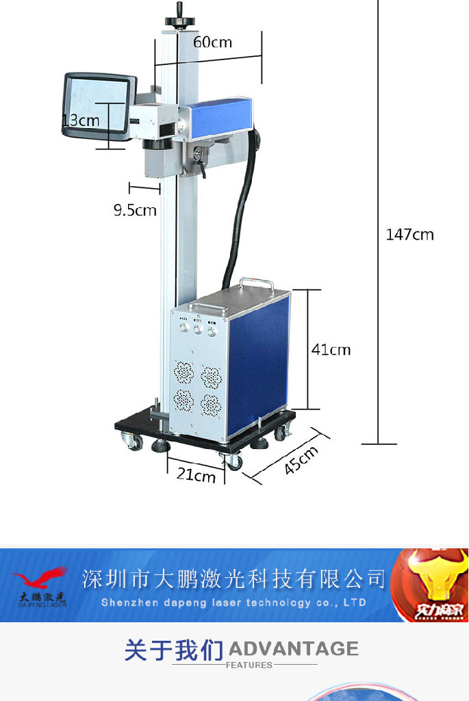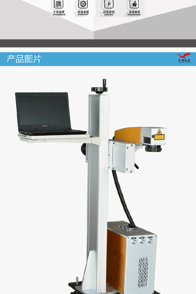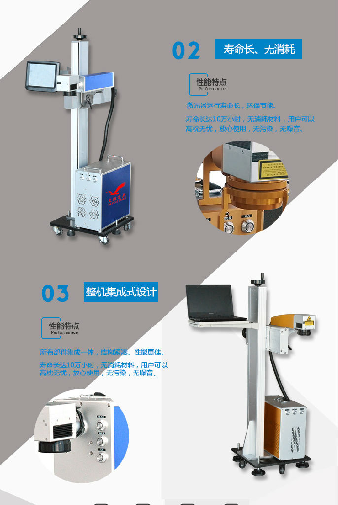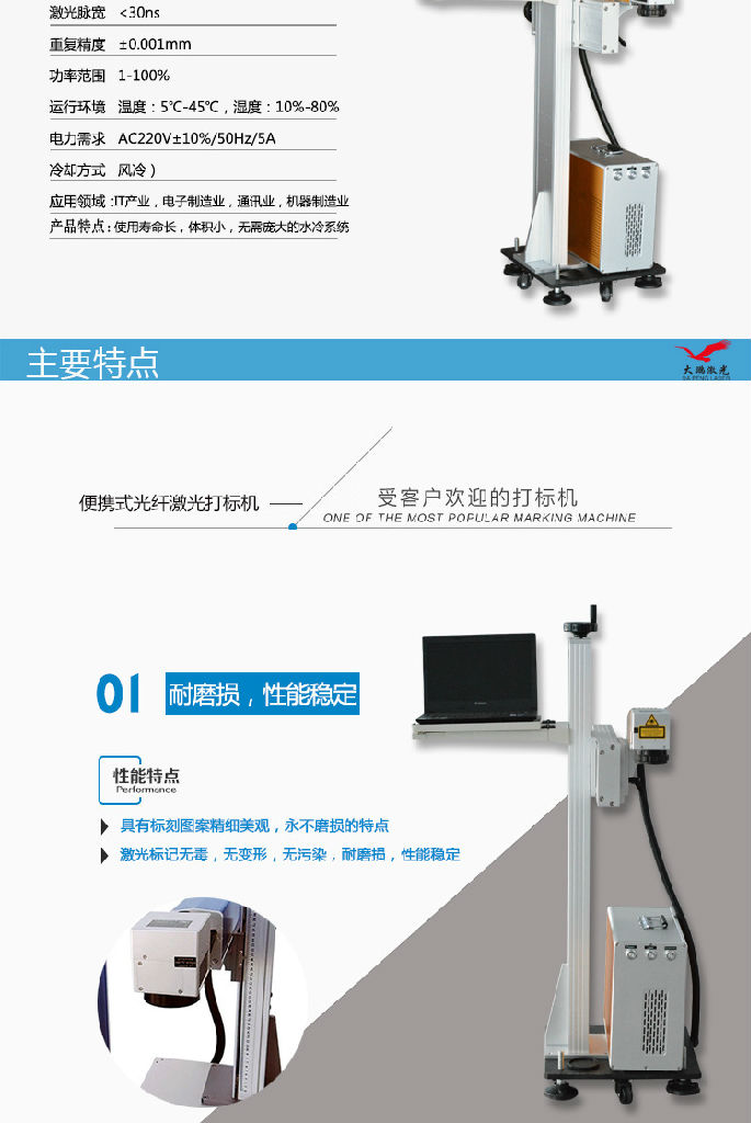 *激光标记无毒,无变形,无污染,耐磨损,性能稳定价格适中,可随意控制打标深度,能长期工作*采用一体化的设计结构,全新的光路密封方式总体稳定可靠,外形美观*继承了前几代固体激光打标机的成熟性和实用性并通过软件和控制系统的升级使得整机的稳定性得到进一步提高*可进行图形微标和文字等任意信息的标记,具有标刻图案精细美观,不磨损的特点机型特点:光纤飞行激光打标机具有质量好整机体积小,打标精度高,速度是传统机的3倍,平时不再换水,换灯,调整光路的烦恼寿命长达10万小时,无消耗材料,用户可以高枕无忧,放心使用,无污染,无噪音、节能省电,耗电量仅为传统激光机的1/25应有领域:广泛用用于精密机械、电子元件、通讯模具、钟表、眼镜、印刷、首饰、五金制品等行业、特别使用于不锈钢高速扫描、透光按键、位图雕刻、模具加工、印字轮雕等对深度、光滑度、精细度要求较高的领域。